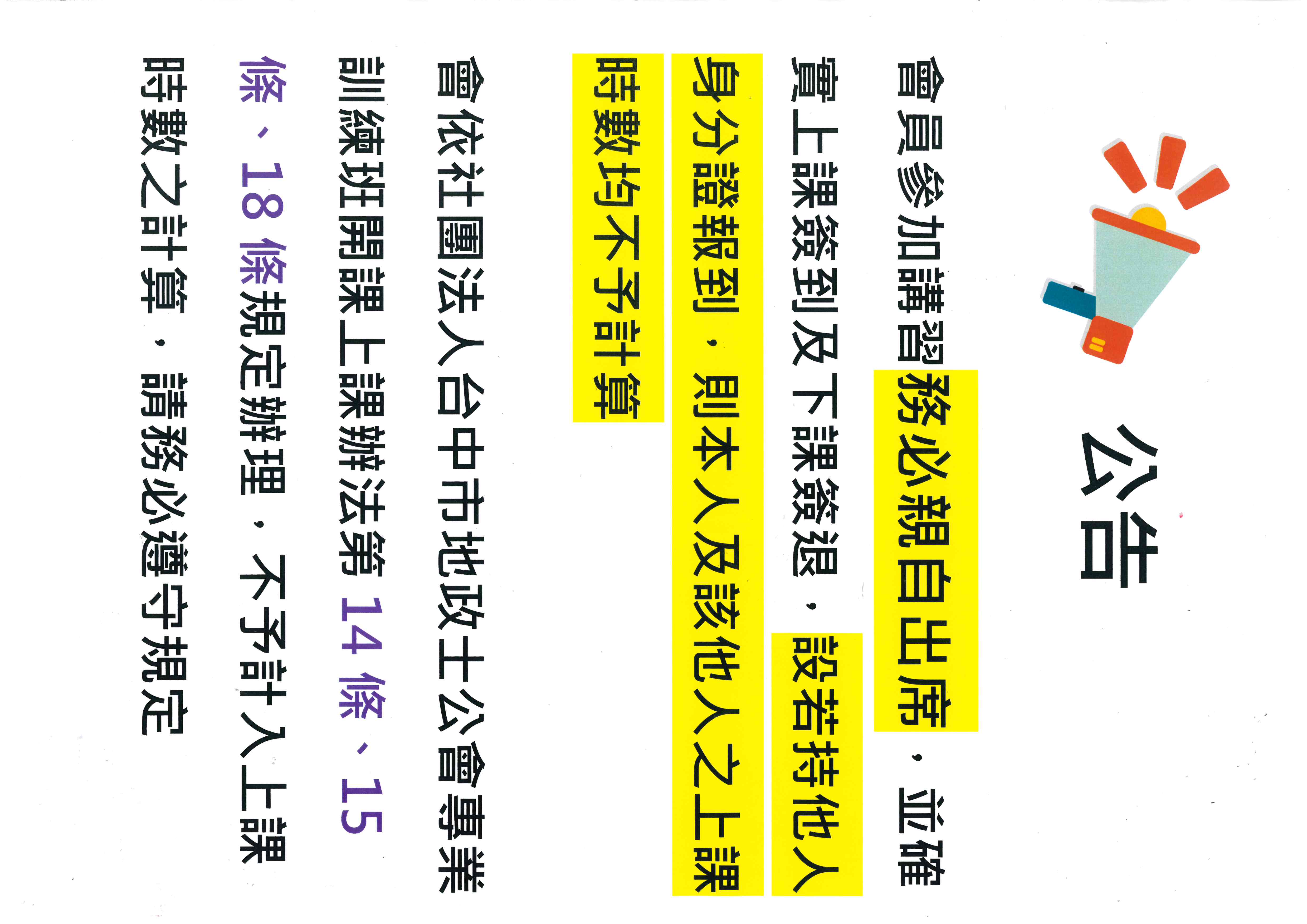 | 注意事項 | 本次課程依「與地政士專業訓練相當之證明文件及得折算專業訓練時數規定」得按實際演講時數計算。報名參加會員請準時上、下課。 如遲到、早退十分鐘以上及中途離席十分鐘以上者,依據地政士專業訓練機關(構)學校認可辦法規定所有時數將無法列入折算時數,尚祈見諒。 |