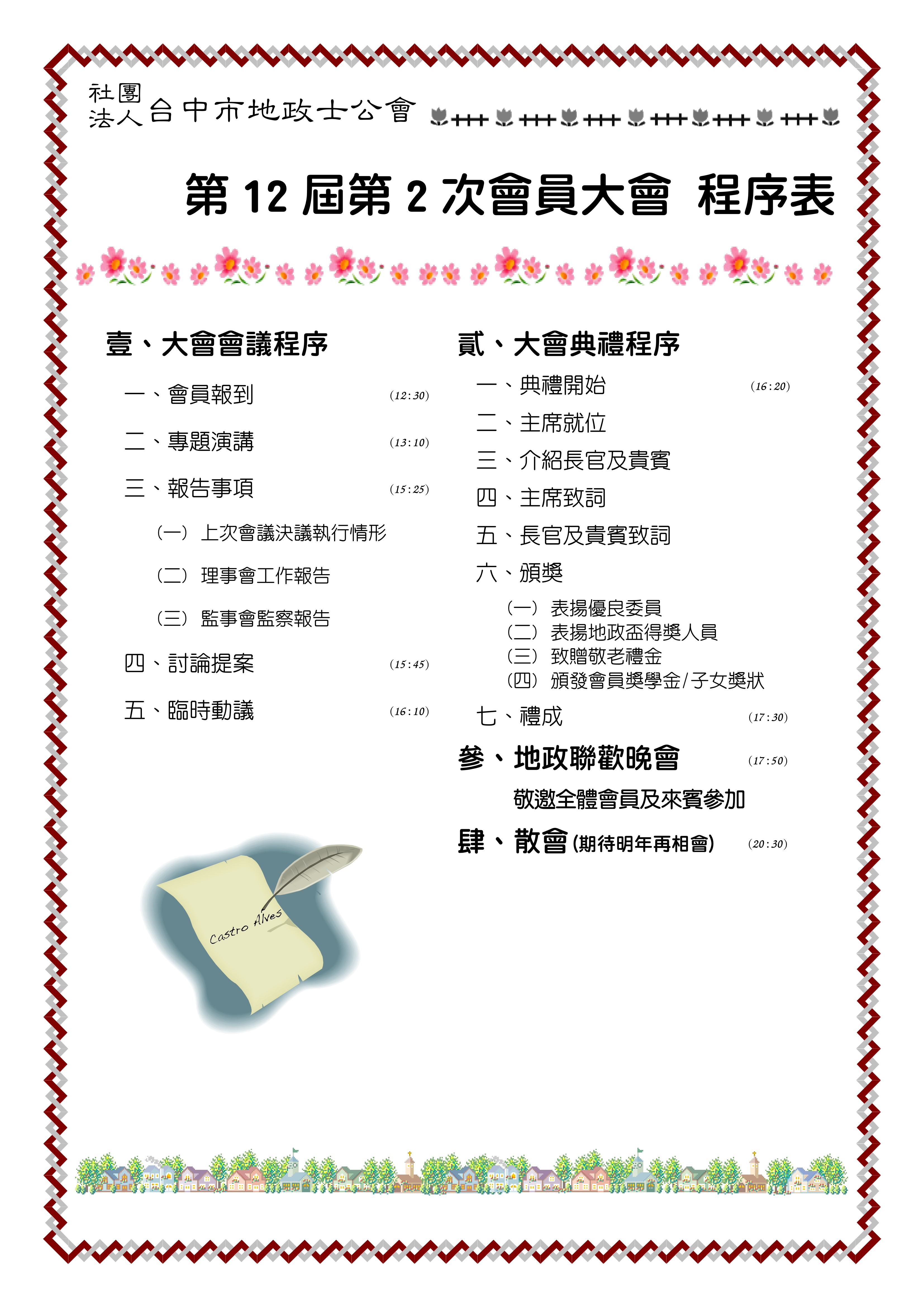 本會訂於115年3月20日(五)舉行第十二屆第二次會員大會 115-02-23 活動日期:115-03-20 活動時間: 活動地點:潮港城國際美食館-3樓帝國廳(臺中市南屯區環中路四段2號)本會訂於115年3月20日(五)舉行第十二屆第二次會員大會。 一、會議種類:例會 二、會議名稱:第十二屆第二次會員大會 三、會議時間:中華民國115年3月20日(五)下午12:30起報到;15:25大會會議程序開始 四、會議地點:潮港城國際美食館-3樓帝國廳(臺中市南屯區環中路四段2號) ☆.大會程序表及委託書,請參閱附件檔案 下載檔案:委託書