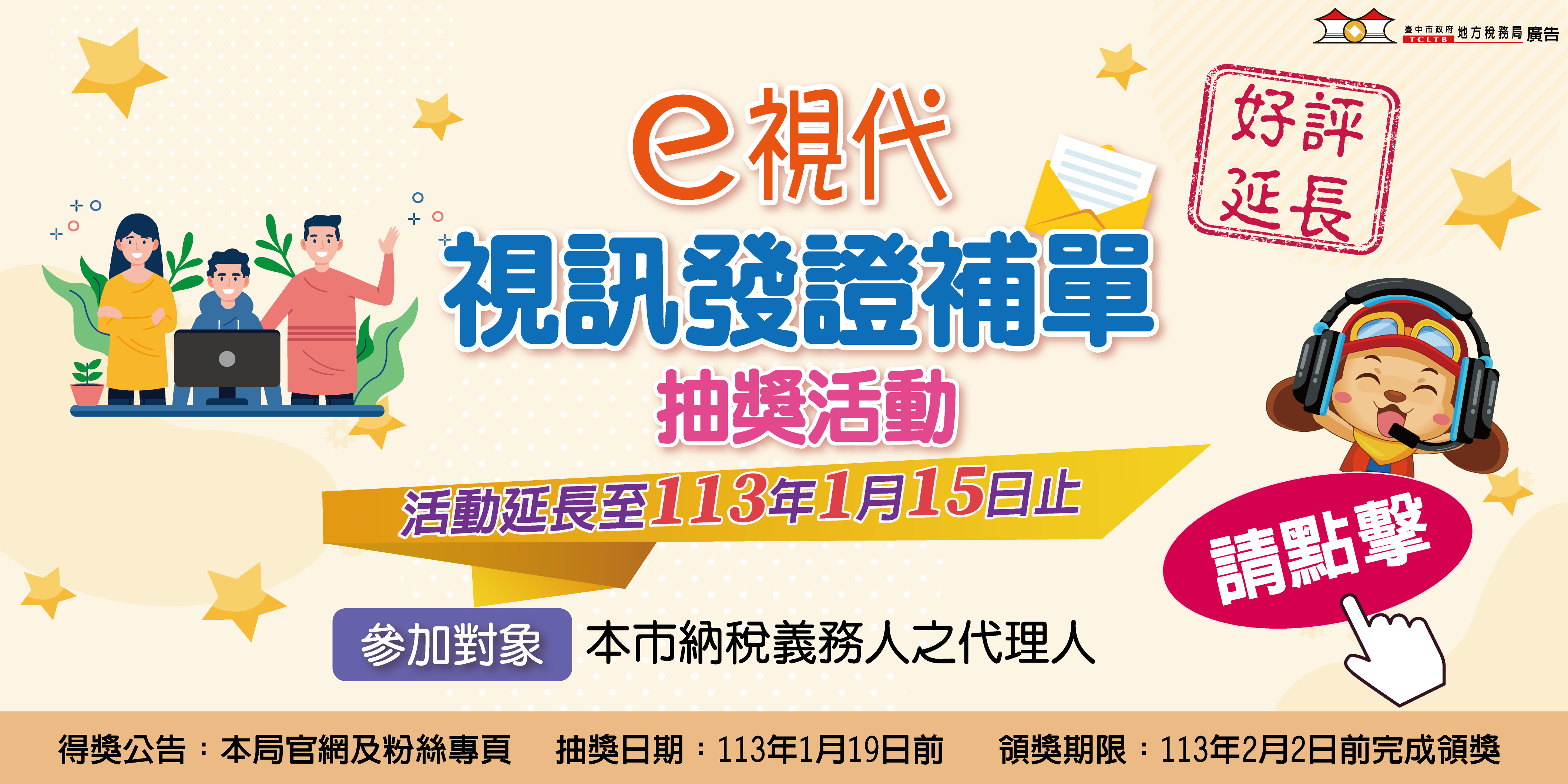 臺中市政府地方稅務局-舉辦「e視代視訊發證補單」抽獎活動,活動期間延長至113年1月15日止,歡迎踴躍參加 113-01-08 活動日期:113-01-15 活動時間: 活動地點:臺中市政府地方稅務局-舉辦「e視代視訊發證補單」抽獎活動,活動期間延長至113年1月15日止,歡迎踴躍參加