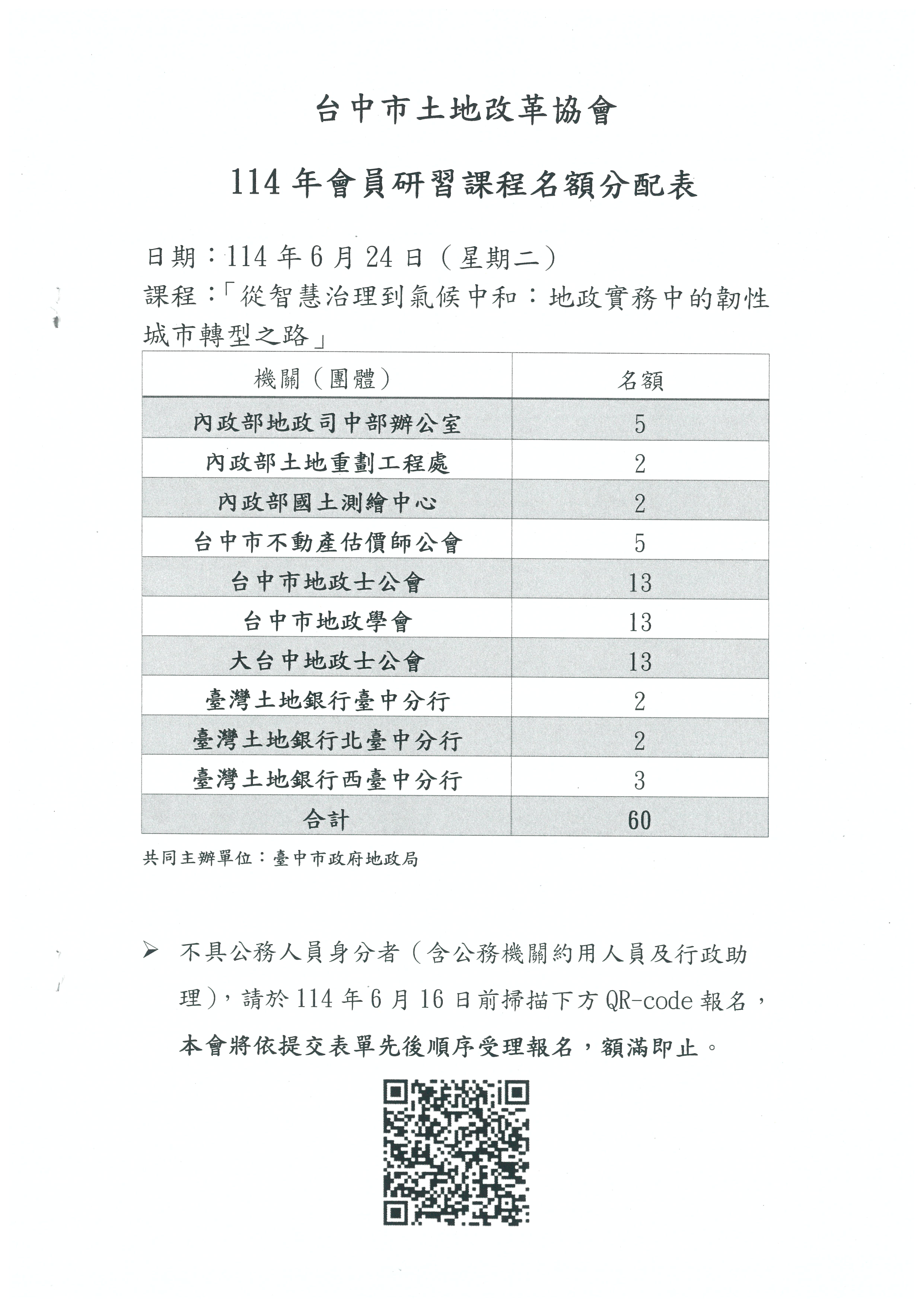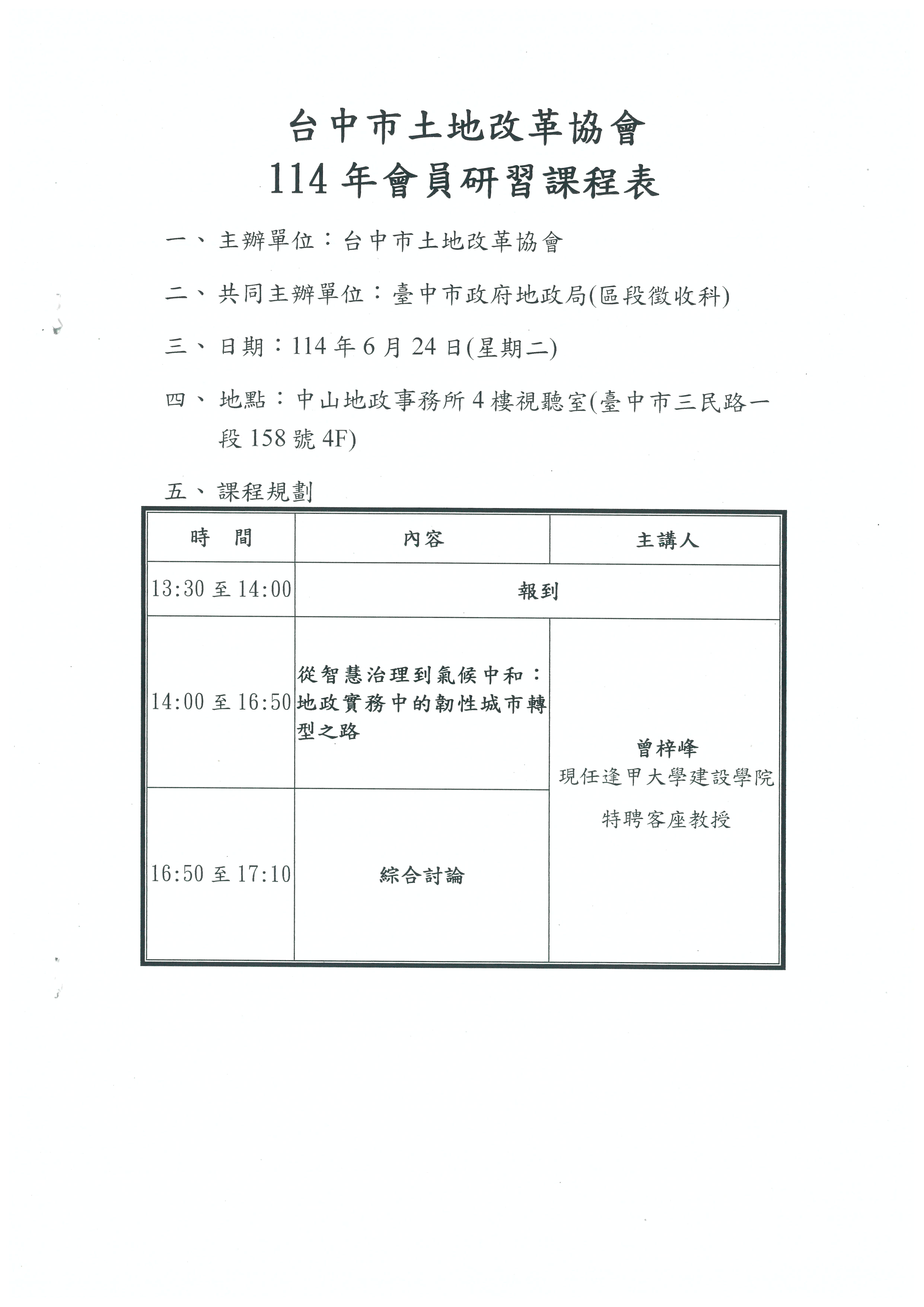 台中市土地改革協會與臺中市政府地政局-舉辦114年「從智慧治理到氣候中和:地政實務中的韌性城市轉型之路」會員研習課程 114-05-29 活動日期:114-06-24 活動時間:下午2:00-5:10 活動地點:中山地政大樓4樓視聽室(臺中市西區三民路一段158號4樓)台中市土地改革協會與臺中市政府地政局-訂於114年6月24日(二)下午舉辦114年「從智慧治理到氣候中和:地政實務中的韌性城市轉型之路」會員研習課程。