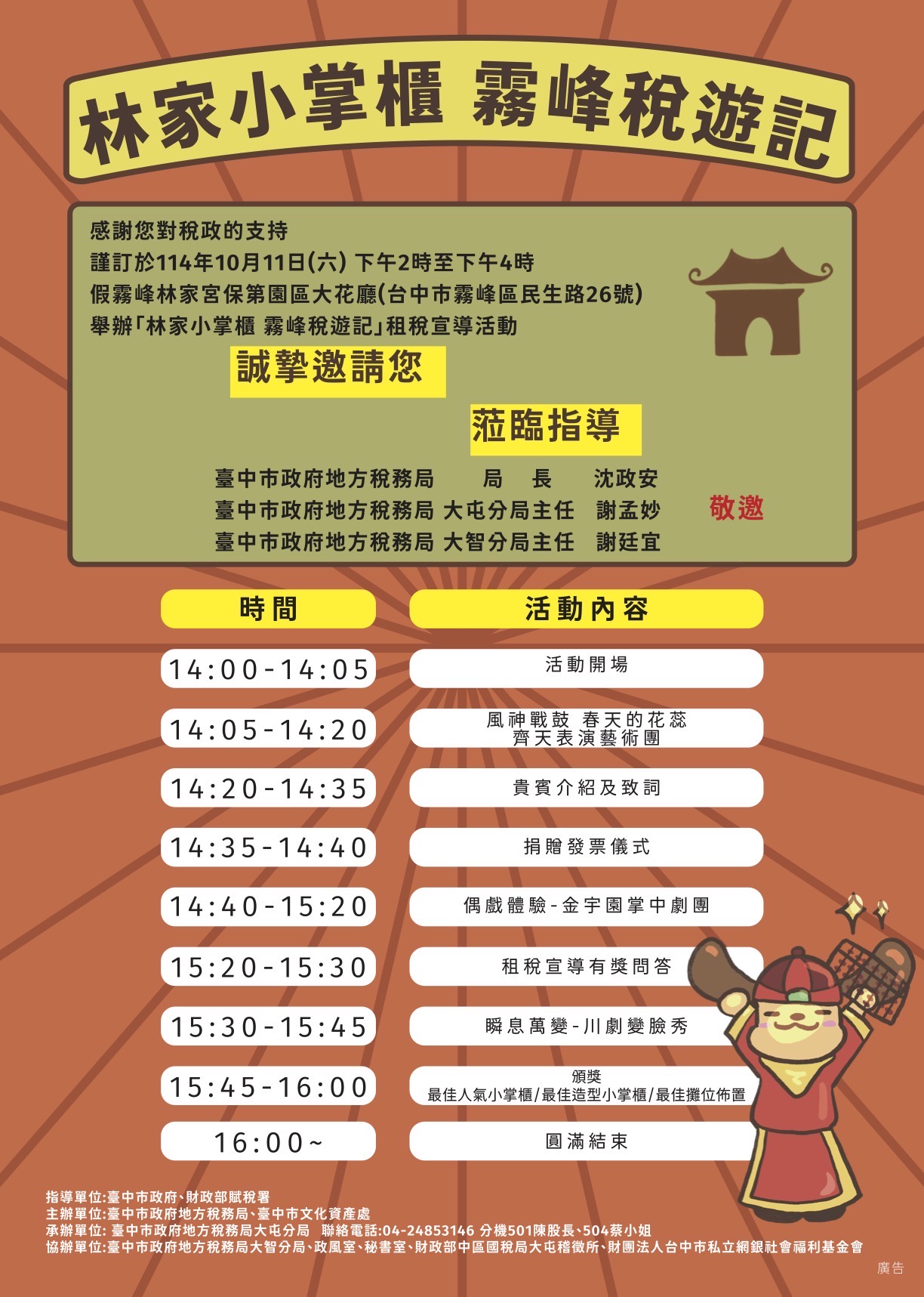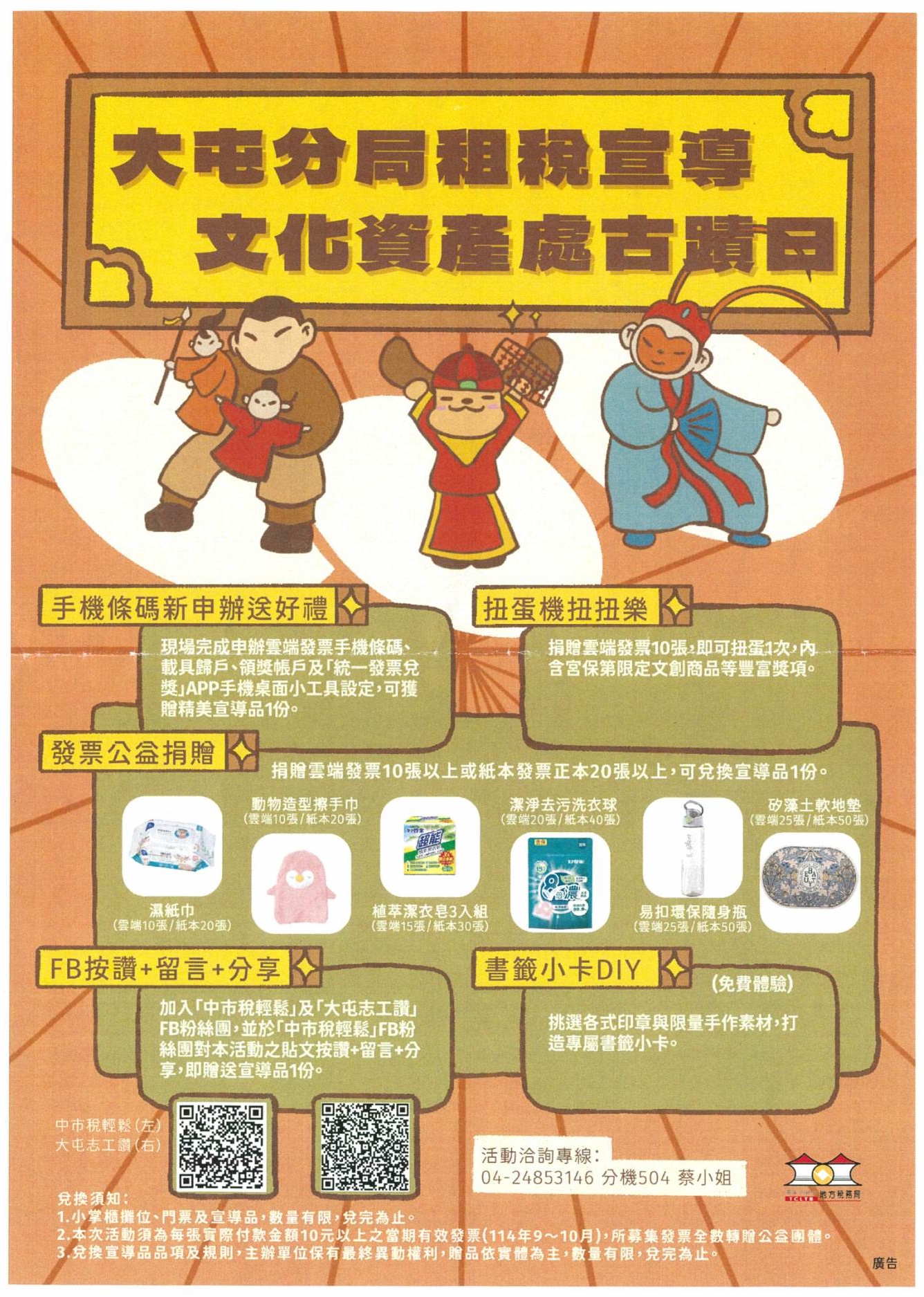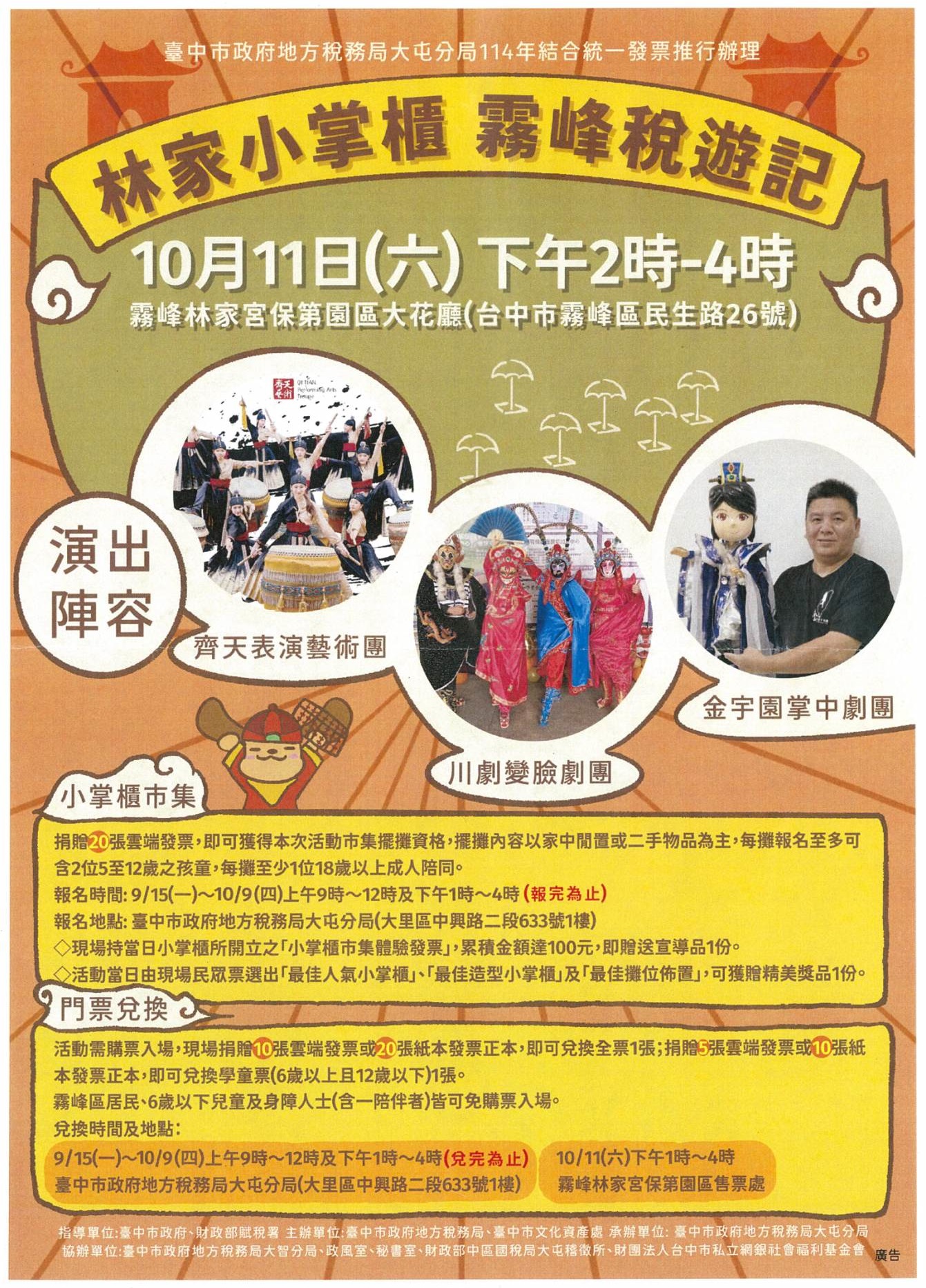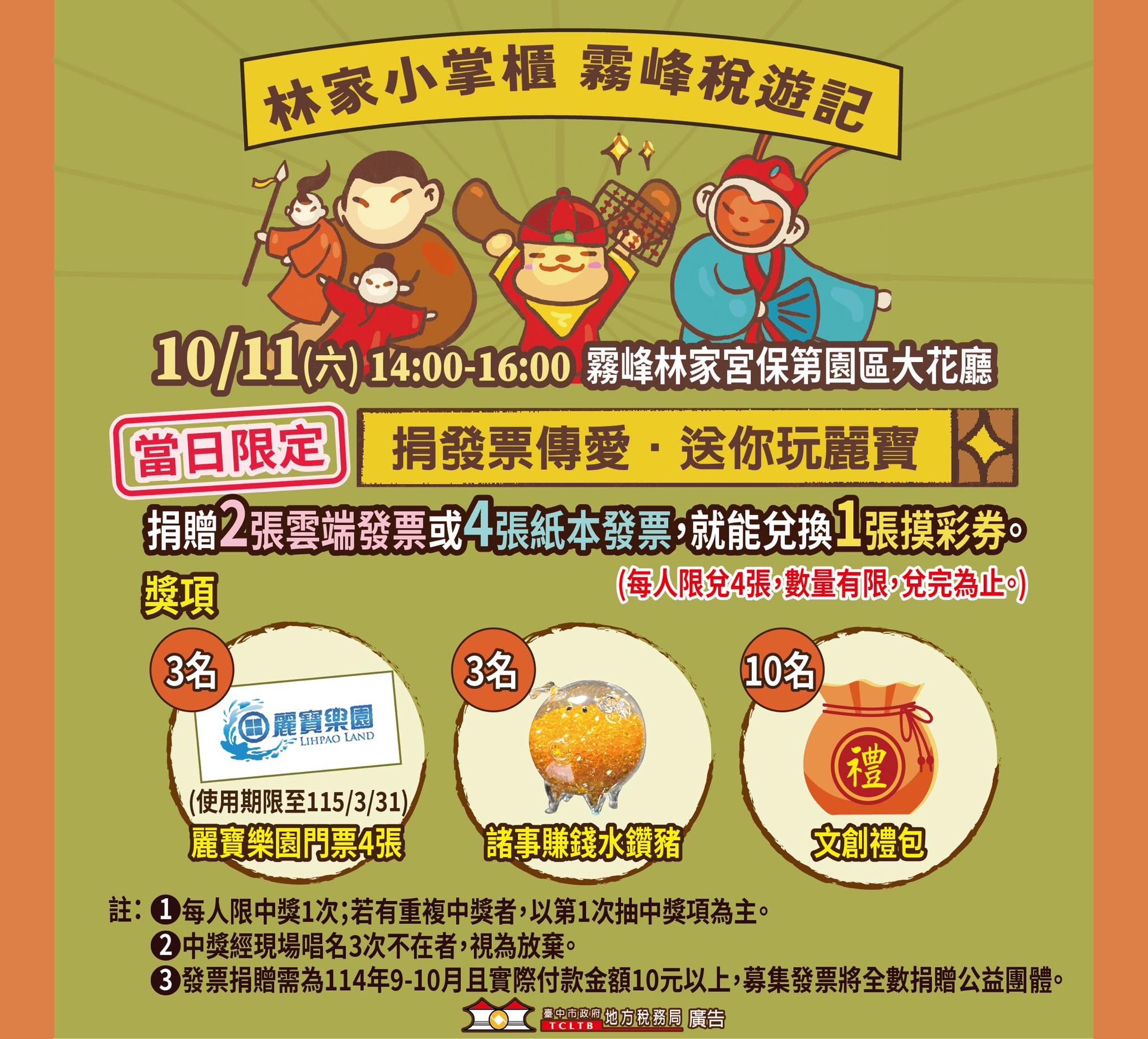 臺中市政府地方稅務局大屯分局-114年結合統一發票推行辦理「林家小掌櫃 霧峰稅遊記」租稅宣導 114-10-02 活動日期:114-10-11 活動時間:下午2:00-4 : 00 活動地點:霧峰林家宮保第園區大花廳(臺中市霧峰區民生路26號)臺中市政府地方稅務局大屯分局-114年結合統一發票推行辦理「林家小掌櫃 霧峰稅遊記」租稅宣導,歡迎會員踴躍參加。 入園門票這樣換: ➤10/9前,可到臺中市政府地方地稅局大屯分局兌換(兌完為止) ➤活動當天,到霧峰林家宮保第園區售票處兌換 全票→捐贈10張雲端發票或20張紙本發票 學童票→捐贈5張雲端發票或10張紙本發票