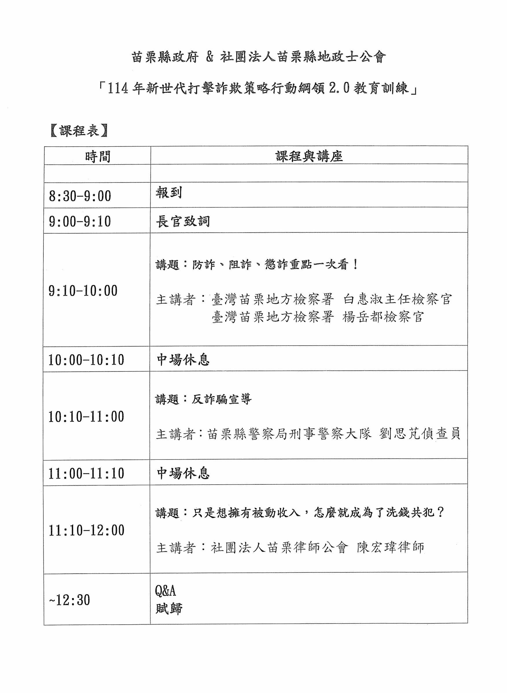 苗栗縣地政士公會與苗栗縣政府-共同舉辦「新世代打擊詐欺策略行動綱領2.0」法治教育宣導課程,歡迎報名參加 114-11-03 活動日期:114-11-20 活動時間:上午9:00-12:30 活動地點:苗栗縣政府第二辦公大樓5樓國際會議廳(苗栗市府前路1號)苗栗縣地政士公會與苗栗縣政府-訂於114年11月20日(四)上午共同舉辦「新世代打擊詐欺策略行動綱領2.0」法治教育宣導課程,歡迎報名參加。 本會名額:15人(全程參加本次講習可折算專業訓練時數3小時),會員如有意願參加,請於114年11月7日下班前電洽公會登記報名。 宣導課程表