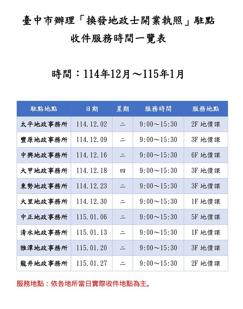 臺中市政府地政局–為加強便民服務,辦理「換發地政士開業執照」駐點收件服務,敬請會員多加利用